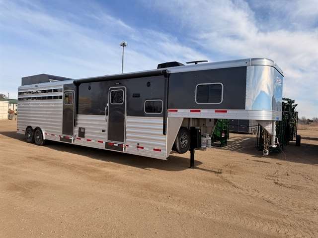 2026 EXISS STC 8032 With Living Quarters 7'8" inside height - 8'0" outside width All aluminum construction w/ single piece aluminum roof Extruded plank flooring w/ 2" x 4" I-beams on 13" centers (2) 8,000 lb. rubber torsion axles w/ electric brakes Five 16" 8-hole aluminum wheels w/ 14 ply Goodyear tires Spare tire w/ exterior mount Single leg hydraulic jack 10'6" shortwall living quarters area Solid wall separating LQ from mid tack and horse area Walk thru door from living quarters to mid tack Walk thru door from mid tack to horse area Fold-up step under LQ area campe Four outside tie rings per side Dual battery box with dual deep cycle batteries Dual propane tank tray under gooseneck 3/8 transferable warranty