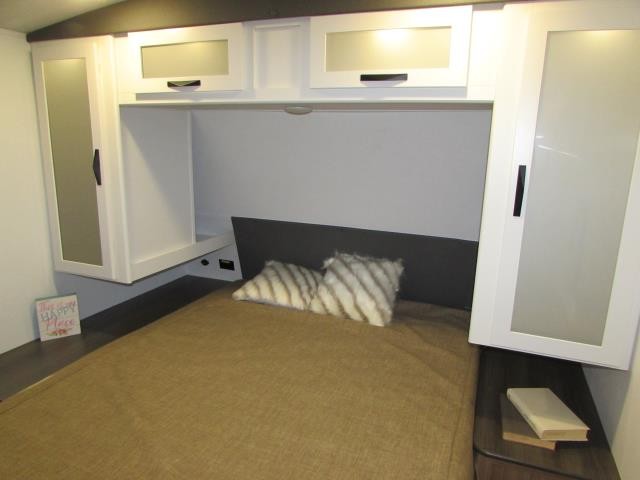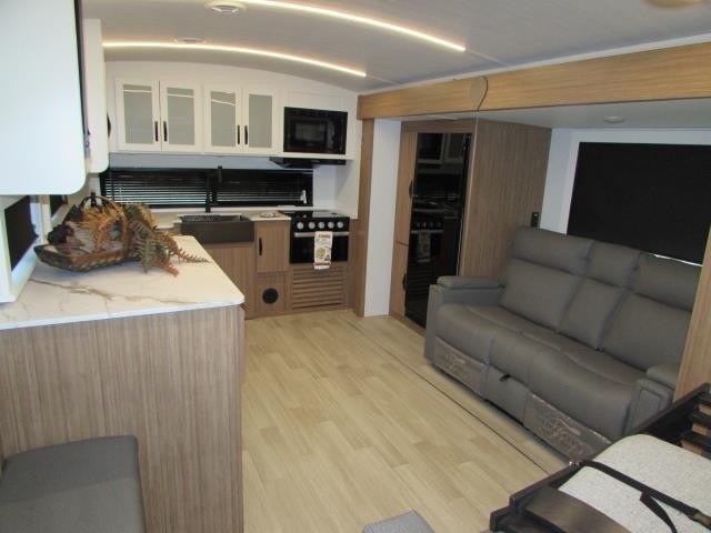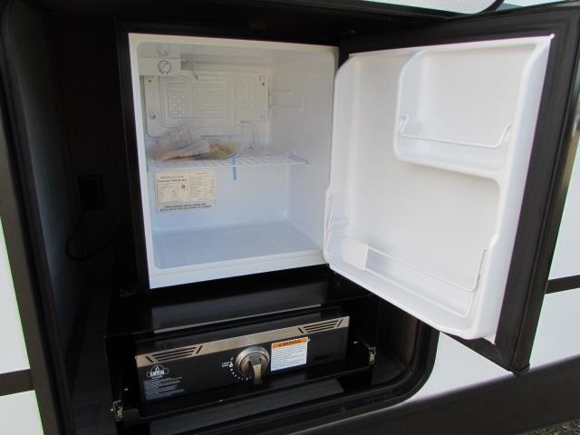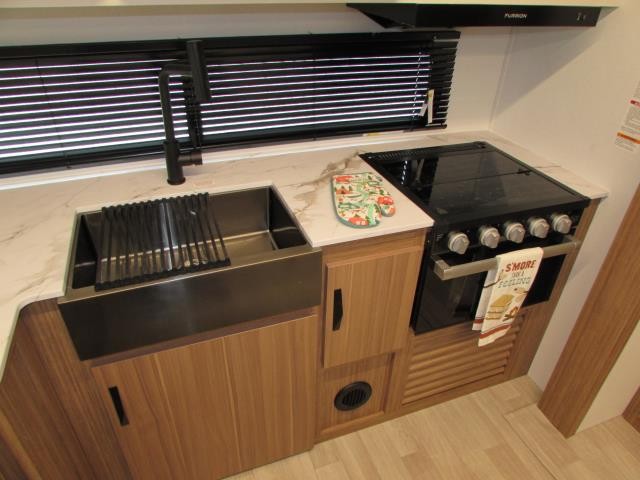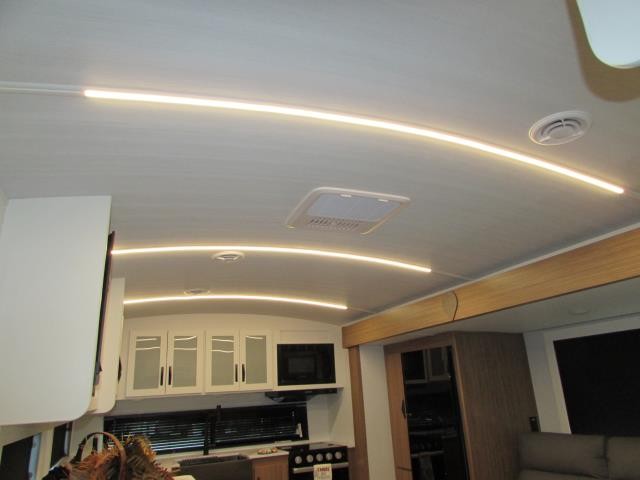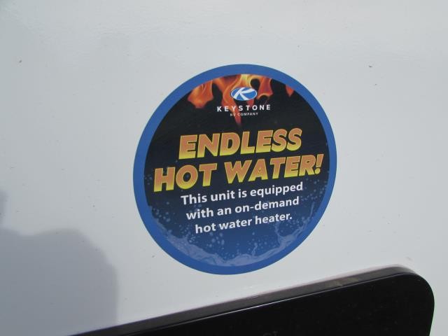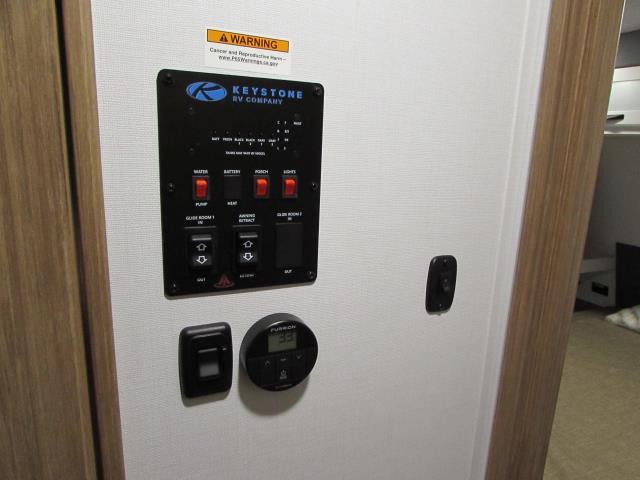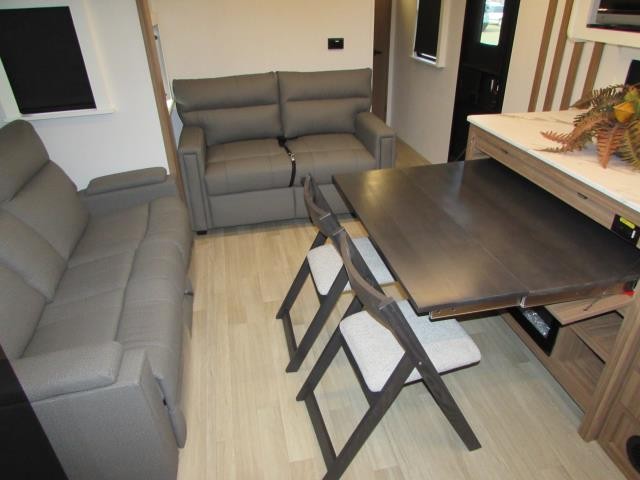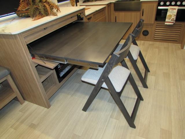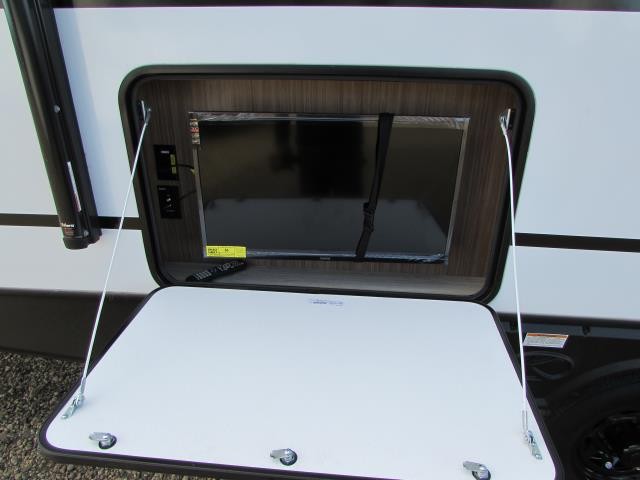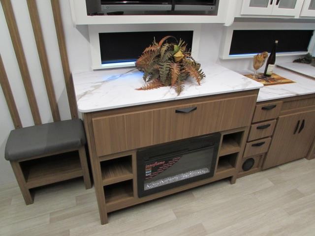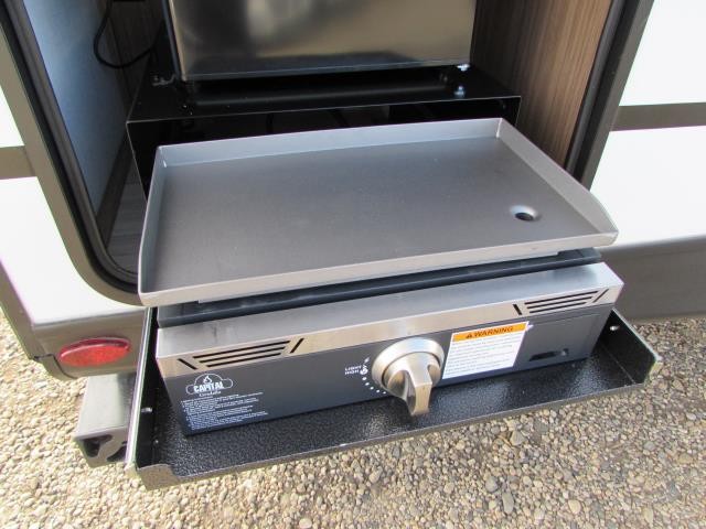 Wow!!! Huge rear kitchen with open dining and living room. Front queen bed with mid bath. TV entertainment with fireplace and bluetooth stereo with outside speakers. There is also an outfoor kitchen with refrigerator and gas griddle, and an outdoor television. This trailer also features the popular Solar Flex 220 package to keep the battery charge for off-grid use. Extended season camping is a plus with the heated enclosed underbelly.