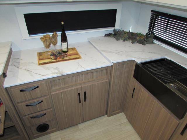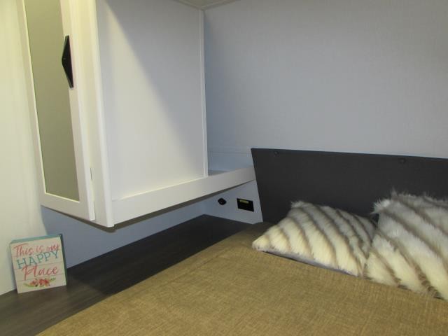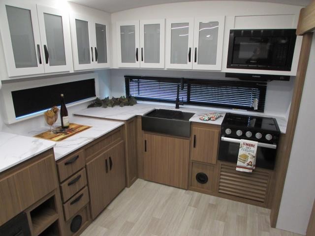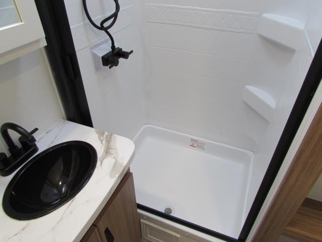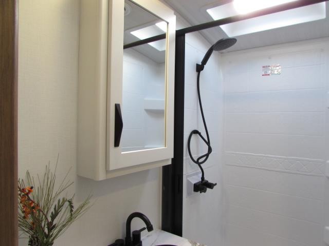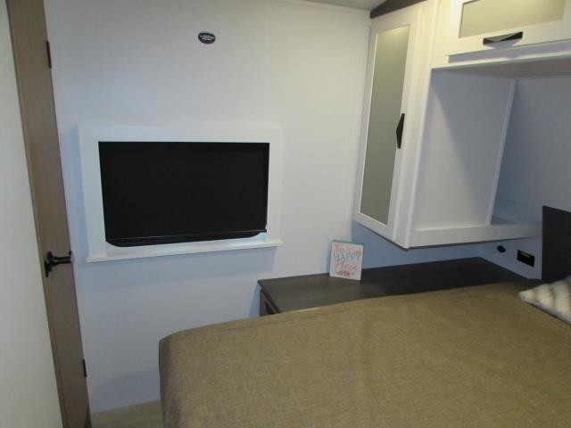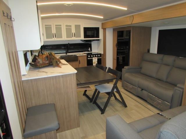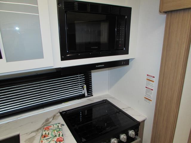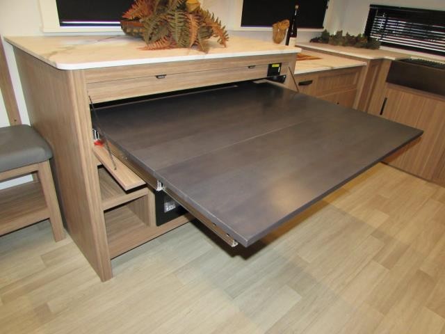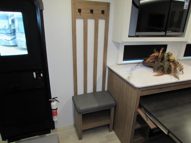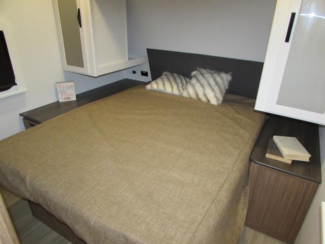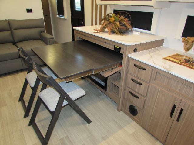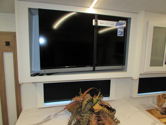 Wow!!! Huge rear kitchen with open dining and living room. Front queen bed with mid bath. TV entertainment with fireplace and bluetooth stereo with outside speakers. There is also an outfoor kitchen with refrigerator and gas griddle, and an outdoor television. This trailer also features the popular Solar Flex 220 package to keep the battery charge for off-grid use. Extended season camping is a plus with the heated enclosed underbelly.