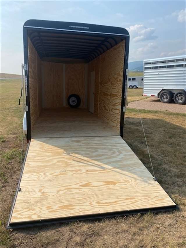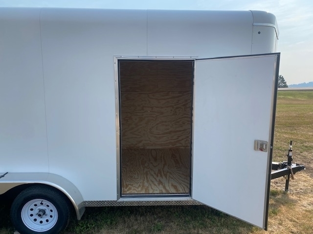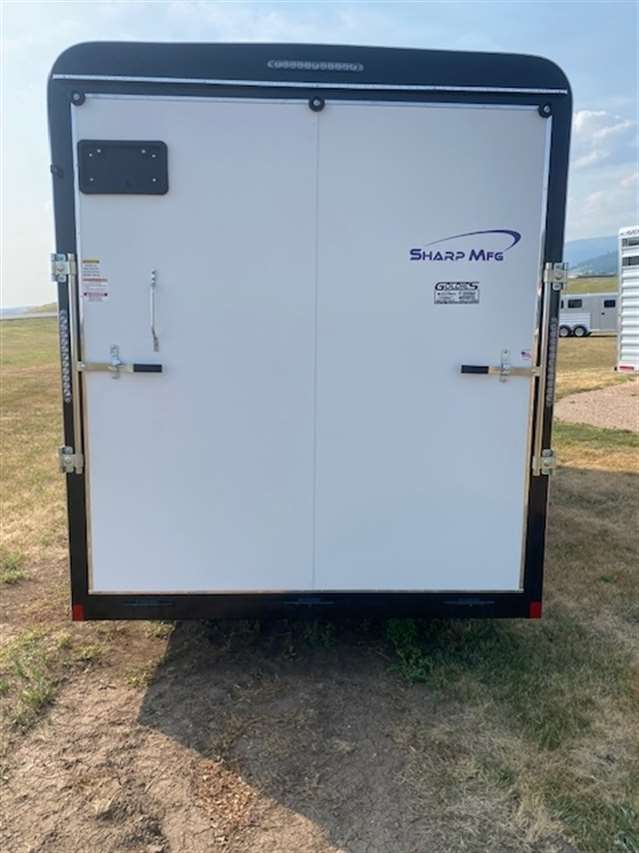 2025 Sharp model 7X14, 7ft wide 14ft long 90 inches tall with a 30 inch V-nose, 16" O.C. 16 gage Tubular Frame & Sidewalls, 16" O.C. 16 gage Roof Bows, 16" O.C. 11 gage Tubing Main Frame, Smooth .040 Aluminum exterior side sheets, Spring assist rear ramp, LED Lighting, 36" Side man door, 3/4" Wood Flooring, 3/8" Wood walls, 24" Aluminum rock guard, Tandem 3500lb. Torsion Axles with electric brakes and 205/75R15C Tires, Galvanized Body Hardware, Undercoated with painted tongue and tail. 5 YEAR LIMITED WARRANTY