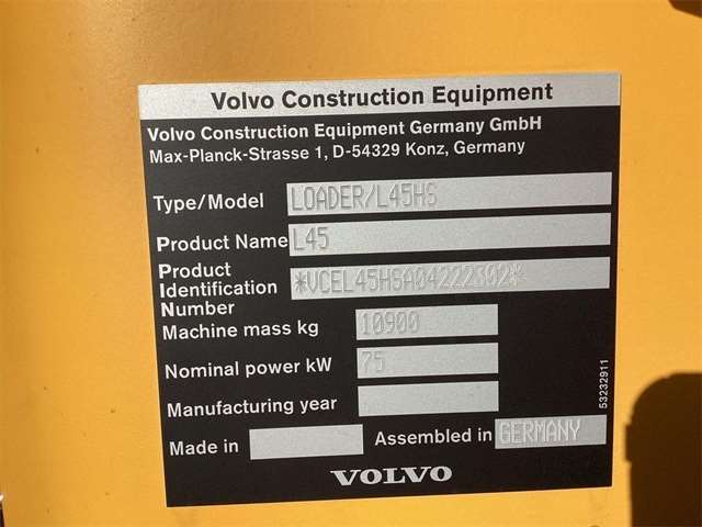 Volvo L45HS Compact Wheelloader GY 17,5R25 TL 3A+ Front Mudflaps Fork Frame, 57 wide Fork tines 55 Long (2) Handthrottle Auto Engine Shutdown_L45/50Block heater, engine (120V) Hand inch electronic function Hyd. Reversible cooling fan Speed limiter, 50 km/h Enclosed Cab Air ride Susp. Seat, Htd. Heated rearview mirrors Seat belt 3 Seat Belt warning HVAC Control panel CELSIUS Radio CD player,AUX/USB/Bluetooth Sliding window RHS Cab door w sliding window Single lever ctrl w 3rd functi LED work lights on cab 2fr,2reReverse alarm audible. Power outlet 12V Rear view camera_ Caretrack GSM AT & T. Rotating beacon. collap. Hyd.mineral fluid ISO VG 46 HVBoom suspension system. Boom kickout. Tilt Cylinder C3_Couplings Hose kit 3rd funct., high flow Wheel chocks Protective wax-coating Documentation American Preparation f license plate Frame Life Time Warranty Certif Paint Volvo design` Attachment Bracket TPV Cast Long boom 103 GP 2.1 cy, 88 w/o teeth Edge bolt-on 88