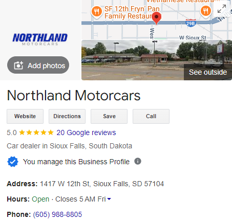 Northland Motorcars serves South Dakota, Iowa, Minnesota, Nebraska and The Surrounding Area. All vehicles are Fully Serviced & Inspected! Please Contact Us For Your No Hassle Experience and Save Time In The Store By Starting The Process Online. We Look Forward To Taking Care Of Your Car Needs Today and In The Future! Free Carfax Report! Financing (WAC) and Vehicle Service Contract Options Available! Come Stop By, Call Us at 605-988-8805 or Schedule Your Test Drive Online Today! All Trades Welcome! We make the buying experience painless and pleasant with our aggressive market pricing. Located at 1417 W 12th St Sioux Falls SD 57104.