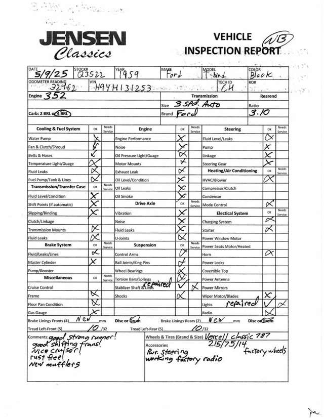 1959 Ford Thunderbird Very original car that’s enjoyed some minor cosmetic tweaking some time ago and still presents well This is a rust, free laser straight 1959 T-bird. Paint is excellent, bright work is all nice, interior is correct and in good condition, factory bucket seats and factory console. The Thunderbird is in turnkey condition meaning everything is operational, even the working factory radio! Horn, wipers, lights, heater, etc. all good to go. Lotta car for not a lot of money, it will make someone an awesome driver or one just to drive on weekends. Take to car shows where it’s sure to do extremely well. It has done well in the past. Check out the pictures of the best of show awards it has won over the years.
