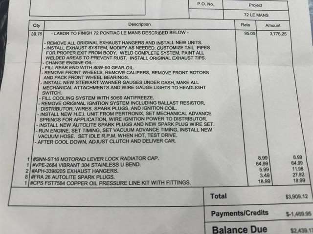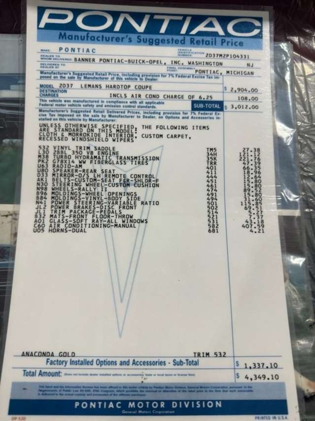 1972 Pontiac LeMans 2-Door Coupe — Hurst 4-Speed, Factory A/C, PHS Documented This is an exceptional, rust-free example of a rare, low-production 1972 Pontiac LeMans 2-Door Coupe, one of only 6,855 coupes produced for the model year. The car remains largely original and highly documented, with tasteful upgrades that significantly enhance drivability while preserving its factory character. Originally equipped with an automatic transmission, this LeMans has been professionally converted to a highly desirable Hurst 4-speed manual, delivering a far more engaging driving experience. Drivetrain & Performance 350 CID V8 engine (strong-running, reported ~43,000 original miles) Hurst 4-speed manual transmission Dual exhaust Power steering Power front disc brakes Factory Options & Equipment Factory air conditioning Factory Rally II mag wheels Raised white letter tires Custom cushion steering wheel Soft Ray tinted glass Dual horns AM radio with rear seat speaker Wheel opening moldings & vinyl side body moldings Custom shoulder seat belts (front & rear) Documentation Pontiac Historic Services (PHS) documentation Original window sticker Factory option breakdown included and verified Condition The car shows no evidence of accidents or prior damage and has been recently repainted to a high professional standard. The body is completely rust free, with excellent panel fit and no sun damage. The original vinyl bench seat interior remains in excellent condition, reflecting careful ownership and long-term garage storage. Background For 1972, the LeMans represented Pontiac’s premium intermediate offering, blending comfort, style, and V8 performance. With low production numbers and strong documentation, examples like this are increasingly collectible. Summary A well-documented, rust-free, low-production 1972 Pontiac LeMans Coupe with desirable factory options, an upgraded 4-speed manual transmission, and excellent overall condition. A standout example ready to be enjoyed or added to a seriou