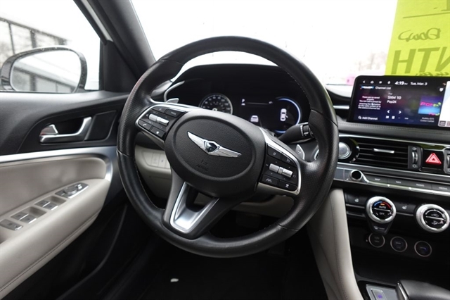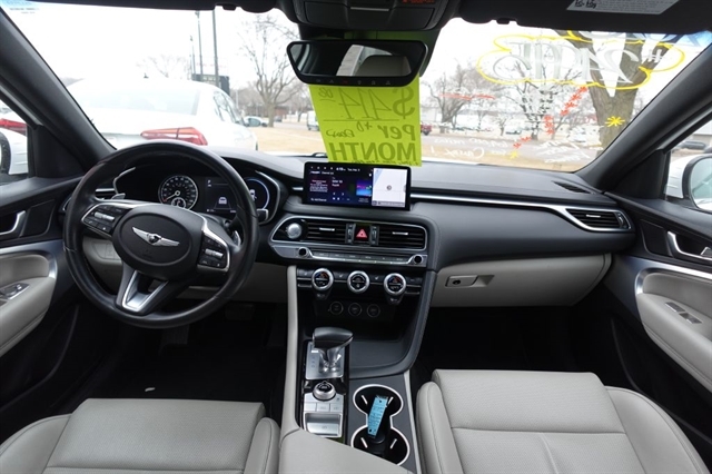 Here is a smoking hot Genesis G70 AWD that is classy and sporty and simply and loaded with great options. The options include All Wheel Drive, 2.0l Turbo that produces a very impress 252hp, 10.3'' Touchscreen Infortainment System, Navigation, Rear View Camera, Leather Seats, Heated Seats, Dual Power Seats, Remote Start, 19'' Alloy Wheels, and of course a long list of Standard Power and Safety Features. The G70 delivers a luxury experience, thanks to attractive materials and excellent build quality. Its driver-centric layout and straightforward controls cater to driving enthusiasts. Likewise, the upscale brightwork and decoratively stitched surfaces on our test car appeased our affluent side. Genesis also keeps things classy by avoiding the urge to plaster faux carbon-fiber bits and a flat-bottom steering wheel into the cabin, and the result is an interior that seems more luxurious than the competition. We offer bank financing with excellent rates and terms right here at the dealership, stop and see why so many people will only purchase their used vehicles from Ideal Wheels with the original Ideal Advantage which provides no labor charge on most repairs. Don't forget to check out the complimentary Carfax.