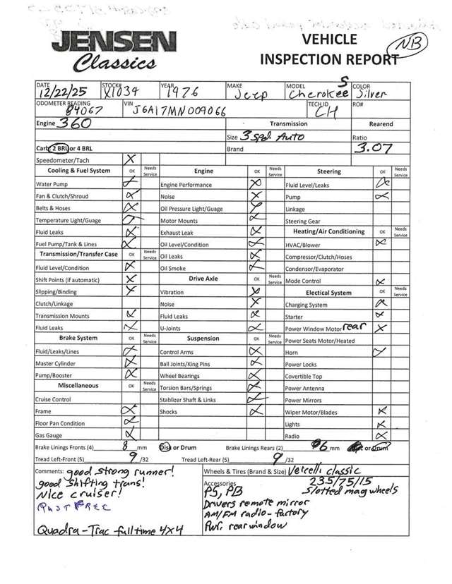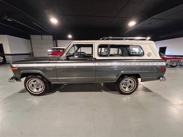1976 Jeep Cherokee Chief “S” • Complete professional restoration • First year for the Cherokee Chief package • Navajo tribal stripe package • Like new correct Cherokee Chief interior • Quadra-Trac full-time 4 x 4 • The 2-door Chief package in 1976 had larger fenders and wider axles • Strong running 360 CI V-8 • Three speed automatic • 3.07 rear end ratio • Power steering • Power brakes • Power rear window • Factory AM/FM radio • Drivers remote mirror • Whiteside wall tires mounted to aluminum wheels • Turnkey condition