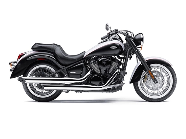 It`s called classic for a reason: it draws its styling cues from days when everyone who was anyone had a muscle car, 8-tracks pumped the tunes out and a low-slung motorcycle turned heads. With its distinctive two-tone Special Edition pearl flat stardust white and flat ebony paint scheme and whitewall tires, the Vulcan® 900 Classic is definitely one bike to get noticed on, with its spoked wheels, low-slung seat and dual slash-cut mufflers.