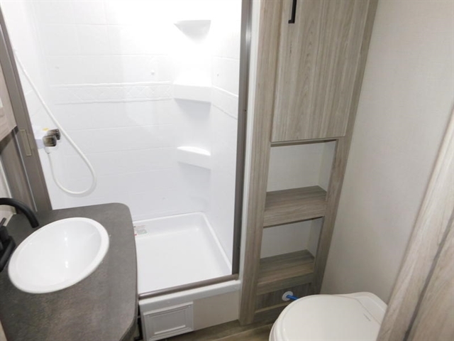 What makes this Passport travel trailer so desirable is the exceptional rear living area! This space has two opposing slides so that you never feel cramped while you relax. There is a tri-fold sleeper sofa and theater seating to lounge on, and the entertainment center has a flat screen LED HDTV and a place to add an optional fireplace. Since the kitchen is included within this same space, you won't have to go far when you want a snack while you're watching a movie. Just head over to the pantry to grab some chips, or you can quickly use the microwave to heat up something from the 8-cubic foot refrigerator. The curio cabinet is also a nice touch to the kitchen because it is both stylish and functional.