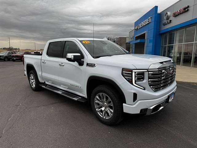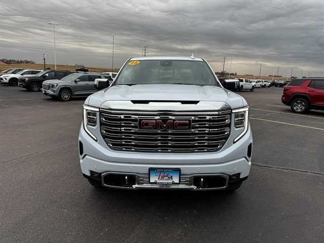Glacier White Tricoat 2026 GMC Sierra 1500 Denali 4WD 10-Speed Automatic EcoTec3 6.2L V8 10-Speed Automatic, 4WD, Atmosphere/Brownstone Leather.