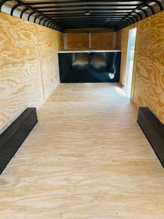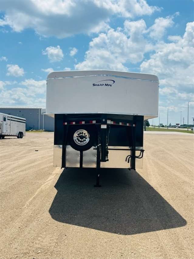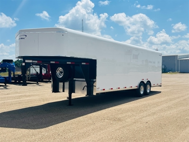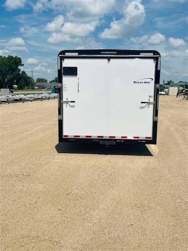 2025 Sharp model 101X24, gooseneck 8ft wide 24ft long 84 inches tall inside , 16" O.C. 11 gauge Tubular Frame , 16" O.C. 16 gage Roof Bows, Smooth .040 Aluminum exterior side sheets, Spring assist rear ramp, LED Lighting, 36" Side man door, 3/4" Wood Flooring, 3/8" Wood walls, 24" Aluminum rock guard, 4 tie rings Tandem 7000lb. Torsion Axles with electric brakes and 235/80R16 Tires, Galvanized Body Hardware, Undercoated with painted tongue and tail. White Color, 5 YEAR LIMITED WARRANTY