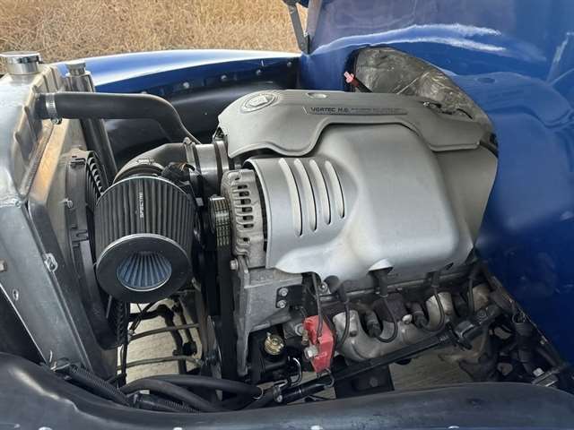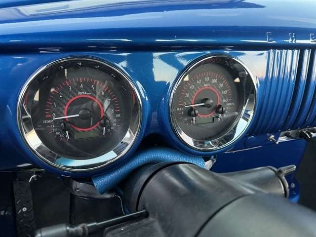 Inside, classic styling is blended with modern convenience. Dakota Digital gauges provide accurate, reliable readouts while maintaining a period-correct appearance. The doors feature shaved handles with electronic door poppers, operated by a remote door opener for a clean, sleek exterior look. Power windows are controlled both by a remote and by original-style window cranks in the doors, preserving the vintage feel while adding modern functionality.