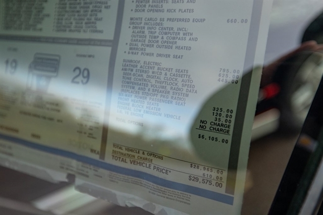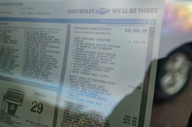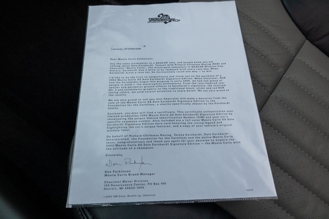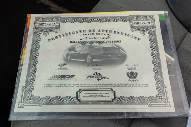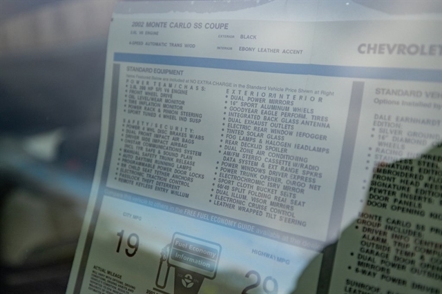Onyx Black 2002 Chevrolet Monte Carlo SS Dale Earnhardt FWD 4-Speed Automatic 3.8L V6 SFI *Leather Seats, Sunroof/Moonroof, Heated Seats, 6-Way Power Driver Seat, Anti-Theft Alarm System, Driver Info Convenience Center, Dual Power Outside Heated Mirrors, Electrochromic Inside Rear-View Mirror, Electronic Cruise Control w/Resume Speed, HomeLink Programmable Garage Door Opener, Illuminated Visor Mirrors, Luggage Area Cargo Net, OnStar Safety and Security System, Preferred Equipment Group 1, Remote Keyless Entry, Trip Computer.