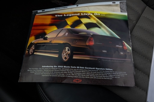 Feast your eyes on this gem: a 2002 Monte Carlo SS Dale Earnhardt edition with only 570 miles on the clock. This beauty is in pristine condition and is looking for its next proud owner. The Dale Earnhardt edition pays tribute to the legendary NASCAR driver with its sleek design, signature black exterior, and unique interior touches. Don`t miss your chance to own a piece of racing history!