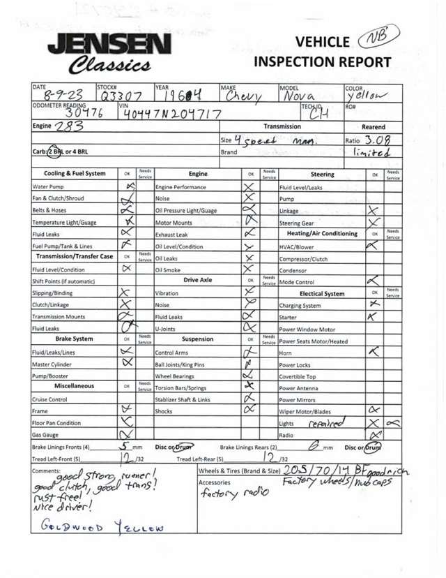 1964 Chevy Nova SS Presenting a 1964 Chevy nova SS that`s fairly remarkable. This is a true SS that`s rust free and mostly all original. Once we performed our inspection, did our due diligence, it was decided in order to bring it to a collectible level, to have it repainted. The body was incredibly solid and there was no rust repair necessitated, so we had it repainted in its original Goldwood Yellow color. The 283 CI V-8 is mated to a four-speed manual transmission, we have every reason to believe is original to the car. The interior is original with the exception of the carpeting and shows extremely well. Turnkey car! Meaning everything is operational and functioning as it should heater, wipers, radio, horn, etc. etc. etc.