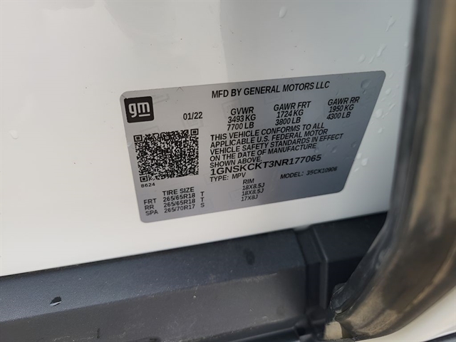 Driver Alert Package: Rear Cross Traffic Alert; Lane Change Alert with Side Blind Zone Alert. Luxury Package: HD Surround Vision; Heated 2nd Row Outboard Seats; 2nd Row Power Release 60/40 Split-Folding Bench Seat; Memory Settings; Power Tilt and Telescopic Steering Column; Rear Pedestrian Alert; Heated Steering Wheel; 3rd Row 60/40 Power-Folding Split-Bench; Outside Heated Power-Adjustable Mirrors. Preferred Equipment Group 1LT: Bright Front and Rear Door Sill Plates; Stop/start System Disable Button; Leather-Appointed Seating; Remote Start; Front and Rear Park Assist; Floor Console with Storage Area; LED Daytime Running Lamps; Driver and Front Outboard Passenger Airbags; 10-Way Power Driver and Passenger Seat Adjusters; Memory Settings For Driver; Heated Driver and Front Passenger Seats; Wireless Charging; Front Bucket Seats; Universal Home Remote; Color-Keyed Carpeting Floor Covering; Hands-Free Rear Power Programmable Liftgate; Chevrolet Infotainment 3 Premium System Radio; Bose 9-Speaker Stereo Audio System Feature; 1st and 2nd Row Color-Keyed Carpeted Floor Mats; Enhanced Driver Information Center; SiriusXM Radio with 360L; Leather-Wrapped Steering Wheel; Infotainment Display; Auto-Dimming Inside Rearview Mirror; Automatic Stop/start. **Equipment listed is based on original vehicle build and subject to change. Please confirm the accuracy of the included equipment by calling the dealer prior to purchase.**