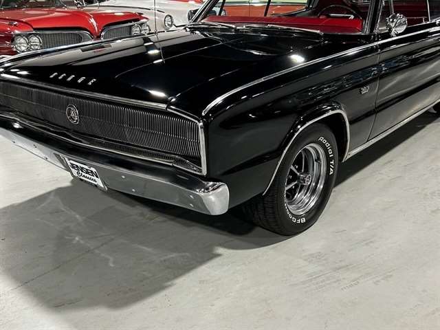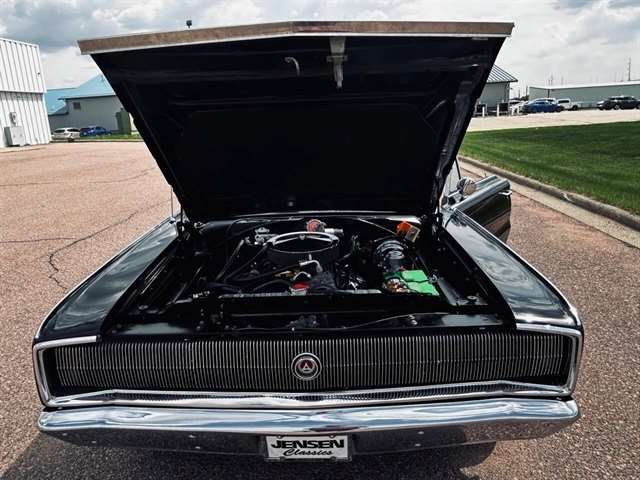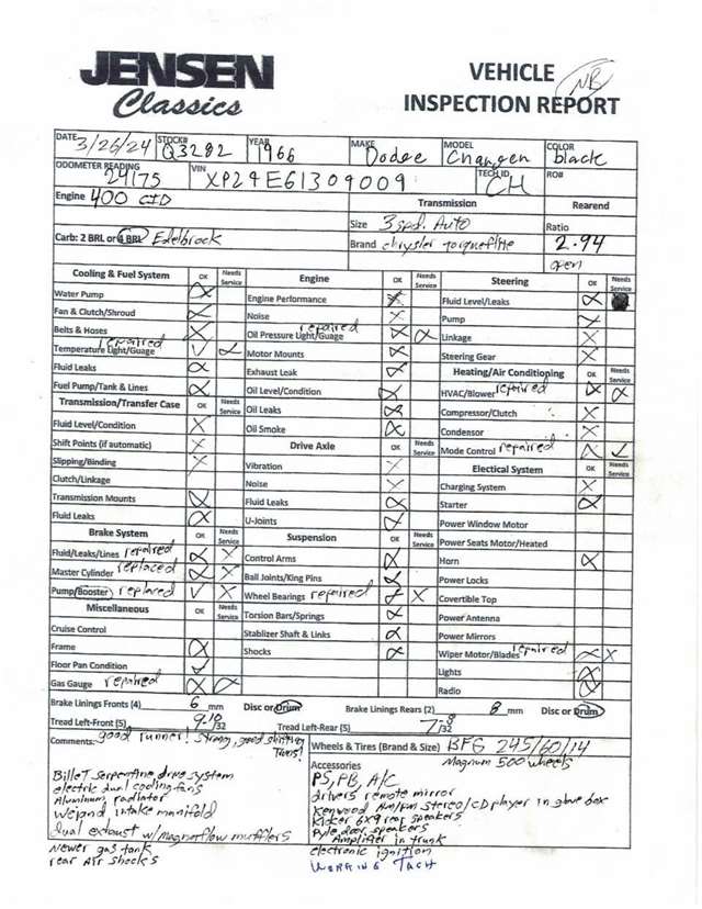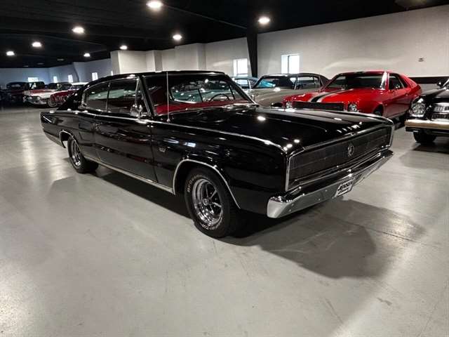 1966 Dodge Charger Mirror-like black paint Big block power Chrysler torque flight transmission Cold factory air Hideaway headlights Electroluminescent dash bezel Working tachometer Magnum 500 wheels Kenwood stereo system Power steering and brakes Billet serpentine drive system Electric cooling fans Aluminum radiator Dual exhaust with Magna Flow muffler Rear air shocks Driver’s door remote mirror Original Chrysler certi-card Owner’s manual