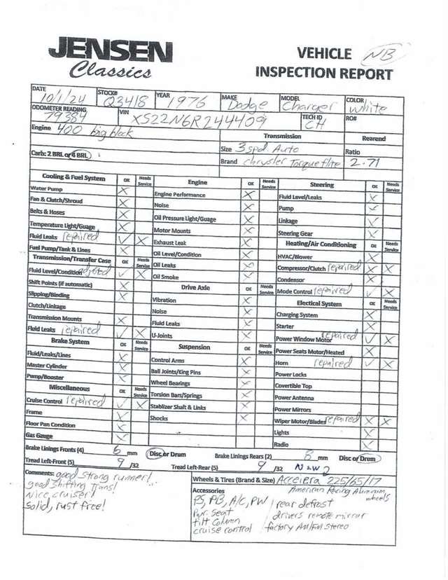 1976 Dodge Charger SE This Eggshell White (EW1) 1976 Charger is an impressive survivor that charms with its originality and possesses more performance potential than most enthusiasts realize. Beneath the expansive hood is the largest engine available that year, the 400 B block V8. This diamond-in-the-rough shares it stroke with the ubiquitous 383, contains more beef around the main bearing than any other B block, has a superior bore/stroke ratio, and accepts many upgrades. Additional features include power steering, power front disc brakes, power windows, power driver’s seat, air conditioning, bulletproof 727 TorqueFlite automatic transmission, front and rear stabilizer bars, tilt steering column, cruise control, AM/FM stereo, and new 225/75R15 tires mounted on custom wheels. This time capsule is in outstanding condition and performs extremely well, cruising effortlessly at highway speeds in complete control. The obviously well-cared for example is in turnkey condition meaning the air conditioning is cold, the cruise control, power windows, power, seat, radio, lights, heat, and DEF, all operating as they should.