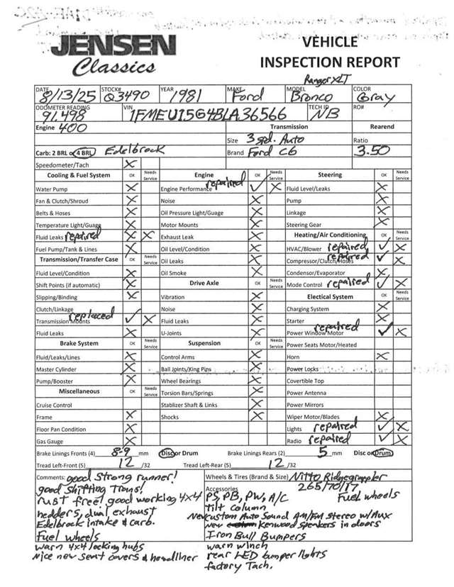 1981 Ford Bronco 4x4 • Comprehensive multi-year restoration • Strong 400 V-8 engine • Ford C6 automatic transmission • Four-wheel-drive • Cold air conditioning • Power steering • Power brakes • Power windows • New paint • New interior • New set of “Fuel “wheels • New 17” Nitto rubber • New Iron Bull bumpers • Warn winch • Factory tachometer • Headers • Dual exhaust • Edelbrock intake and carburetor