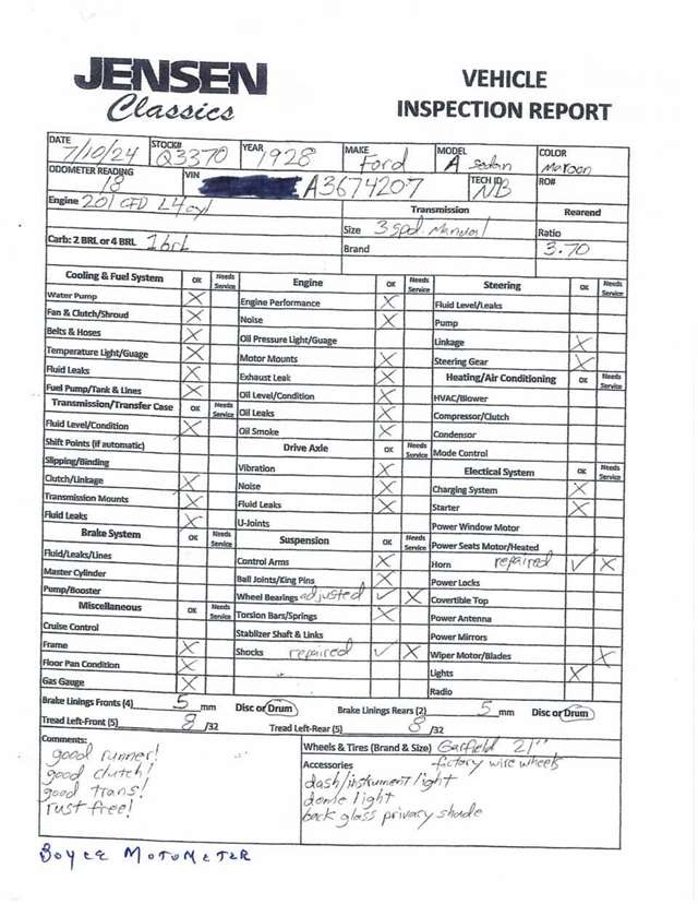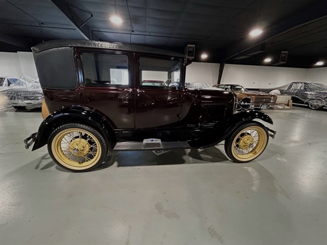 1928 Ford Model A Fordor Sedan The Ford Model A produced from 1927 through 1931 was Ford Motor Company’s second market success replacing the venerable model T which had been produced for 18 years. The Model A was first produced on October 20, 1927, but not introduced until December 2. This new Model A was designated a 1928 model. This example has been restored top to bottom, front to back, leaving no stone unturned throughout its professional restoration. Just a beautiful Model A and in turnkey condition as well. The closer you look the more you like. Gotta love the suicide doors on this baby. Strong runner, great clutch, good transmission, rust free body with all kinds of equipment back in the day, including factory wire wheels, a dash instrument light, dome light, and the back glass with privacy shade. Plus The Boyce Motometer is intact, looks great and functioning as it should.