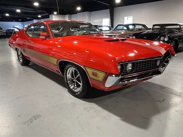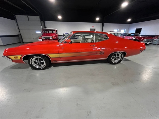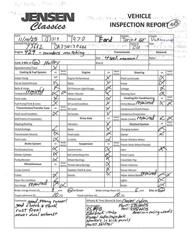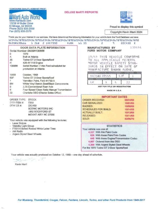 1970 Ford Torino GT • Numbers matching 429 CI 4-BBL V-8 engine • Four Speed transmission • Power steering • Power brakes • Turnkey condition • Deluxe Marti report DOOR DATA PLATE INFORMATION Serial number 0A35N130666 0 1970 A Built at Atlanta 35 Torino GT 2-Door SportsRoof N 429 4V V-8 Engine 130666 Serial number of this Ford sheduled for production at Atlanta 10/69 October, 1969 63F Torino GT 2 Door SportsRoof 1 Vermillion Paint, Ford #1730-A 6W White Vinyl Bench Seat/Black Components 9 3.25 Conventional Rear Axle 6 Four-Speed Close Ratio Manual Transmission 22 Charlotte DSO (District Sales Office) STATISTICS This vehicle is one of: 4,227 with this paint code 626 with these paint/trim codes 645 with these engine/transmission codes 4,007 ordered from this DSO 4,300 with Argent styled steel wheels For the 1970 Torino GT 2-Door SportsRoof