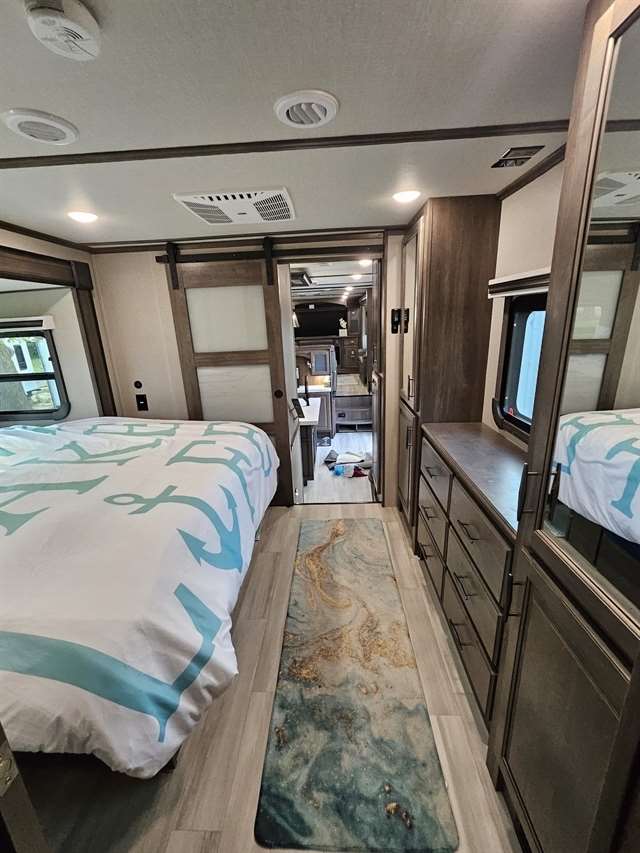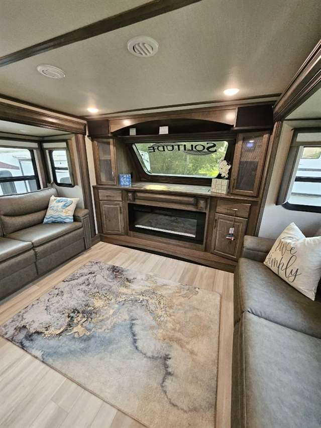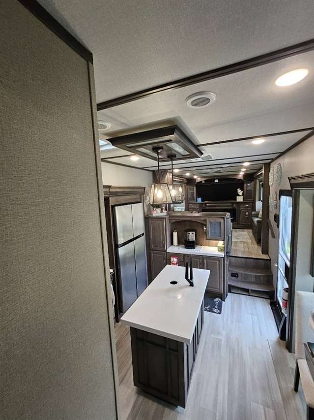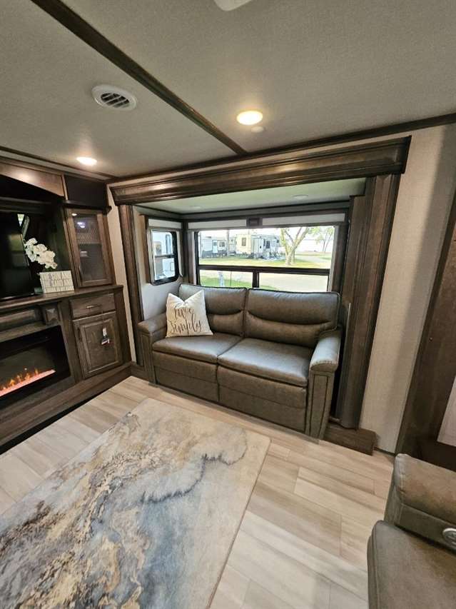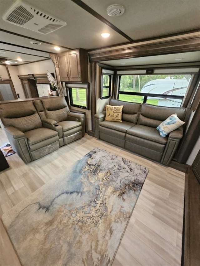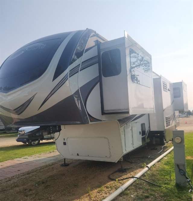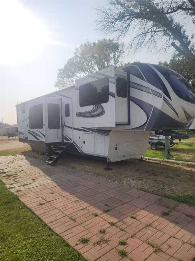 Four Seasons WeatherTech Artic Insulation Weather Protection. 5 Slides. 41' Long. Full and 1/2 Bath. Dual Sink Vanity in Full Bath. Separate Front Living Area. Dual opposing Tri-fold Sofa's. Theatre Seats with Heat, massage, & Recline. 36" Electric Fireplace. TV that raises up out of stand. Kitchen Island. Stainless Steel 4 Door Refrigerator. Large Pantry with Slide out drawers. Walk Through bedroom with King Size Bed. Central Vacuum. Washer/Dryer Combo(never used), 6 point automatic leveling system, 2 outside awnings. Control camper from controls on phone. 3 Air Conditioners. Moride 5th wheel hitch and slide out tray under camper. This is a luxury camper for extended stay or snow bird campers. Gently used and well kept and clean. Must see. Not used in 2025. Willing to deliver and set up.