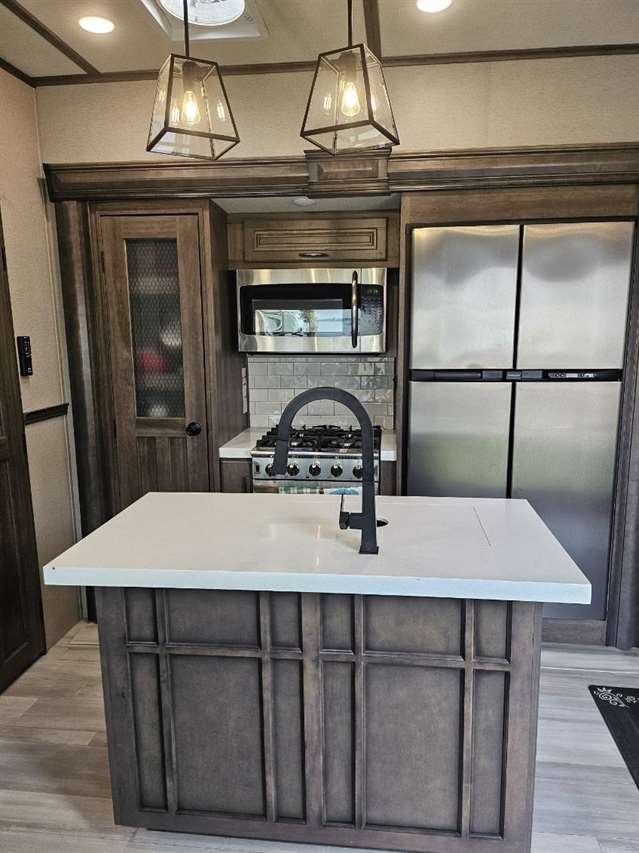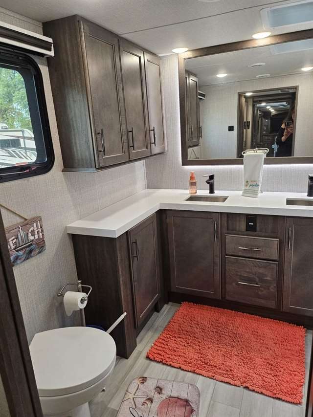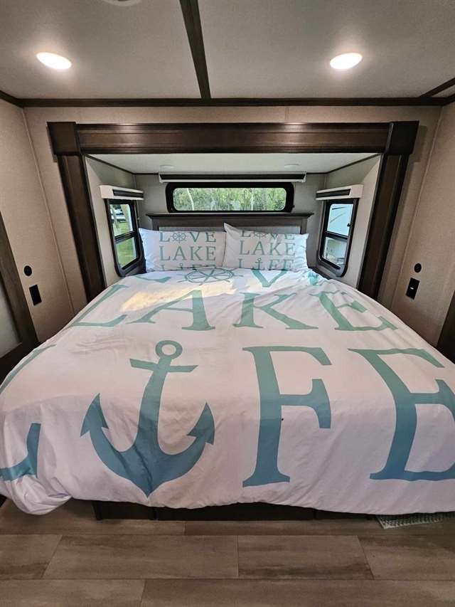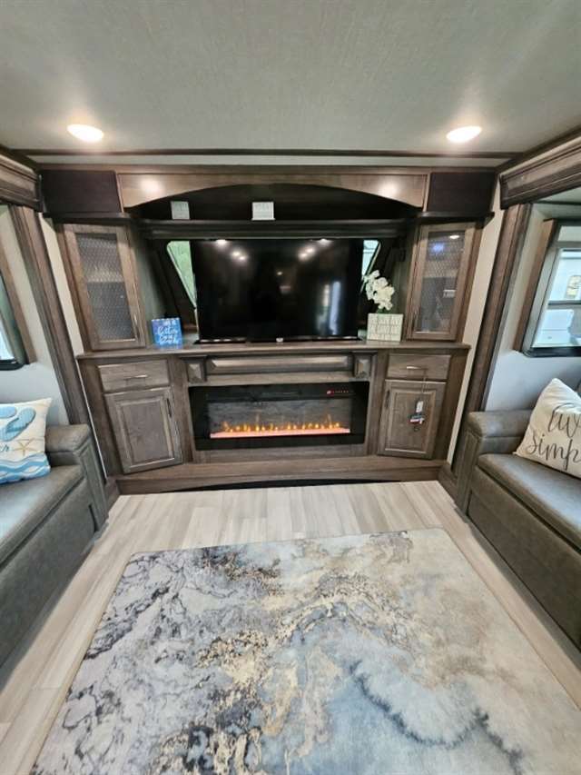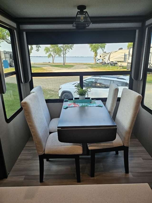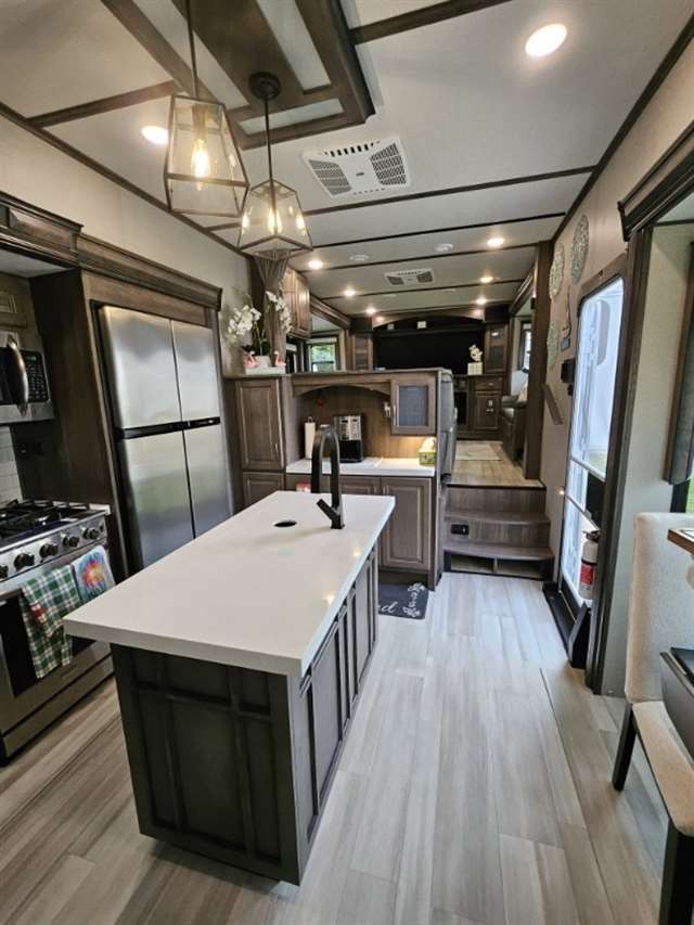 Four Seasons WeatherTech Artic Insulation Weather Protection. 5 Slides. 41' Long. Full and 1/2 Bath. Dual Sink Vanity in Full Bath. Separate Front Living Area. Dual opposing Tri-fold Sofa's. Theatre Seats with Heat, massage, & Recline. 36" Electric Fireplace. TV that raises up out of stand. Kitchen Island. Stainless Steel 4 Door Refrigerator. Large Pantry with Slide out drawers. Walk Through bedroom with King Size Bed. Central Vacuum. Washer/Dryer Combo(never used), 6 point automatic leveling system, 2 outside awnings. Control camper from controls on phone. 3 Air Conditioners. Moride 5th wheel hitch and slide out tray under camper. This is a luxury camper for extended stay or snow bird campers. Gently used and well kept and clean. Must see. Not used in 2025. Willing to deliver and set up.