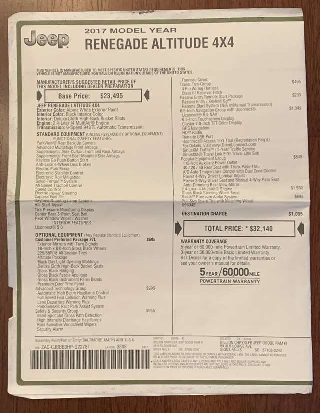 Excellent condition one owner 2017 Jeep Renegade Altitude with only 35,400 miles. Accident free, never smoked in, well cared for. Very clean both inside and out, not abused, regularly scheduled maintenance items have been handled as needed. New set of tires installed July 2025. Beats premium audio system. Highly optioned.