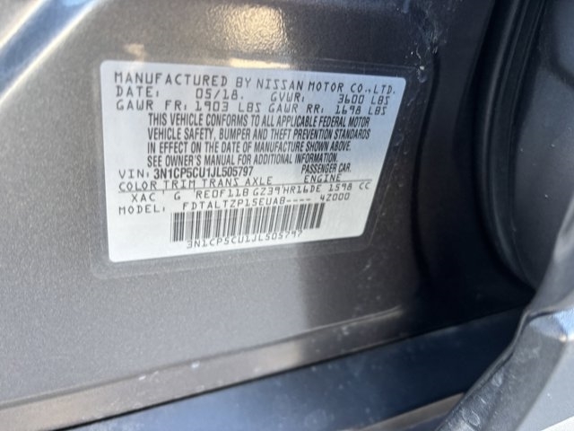 Check out this 2018 Nissan Kicks SR before it's too late!*This Nissan Kicks Is Competitively Priced with These Options *CHARCOAL, PRIMA-TEX APPOINTED SEAT TRIM, CHARCOAL, CLOTH SEAT TRIM -inc: interior trim and accents, [R11] REAR ROOF SPOILER, [N92] ILLUMINATED KICK PLATES, [L92] CARPETED FLOOR MATS W/CARGO MAT, [B92] SPLASH GUARDS (4 PIECE), Wheels: 17" Alloy, Wheels w/Machined w/Painted Accents Accents, Variable Intermittent Wipers, Trip Computer.*Stop By Today *Come in for a quick visit at Cornhusker Nissan, 2125 Krenzien Dr. Norfolk, NE 68701 to claim your Nissan Kicks!