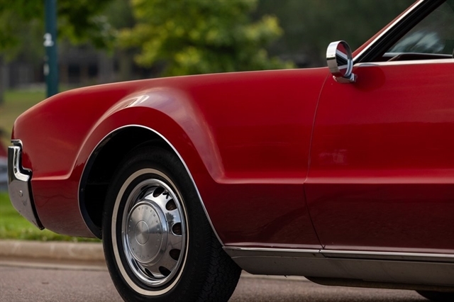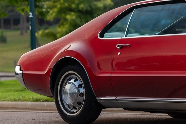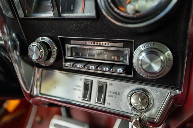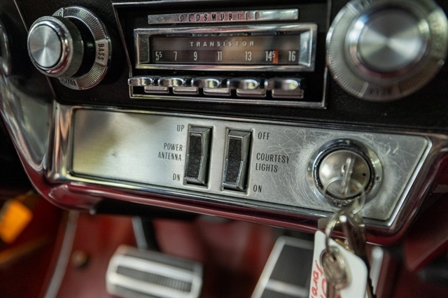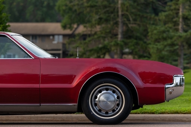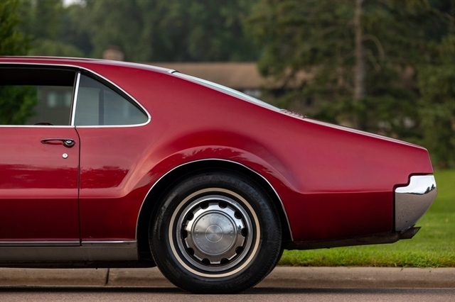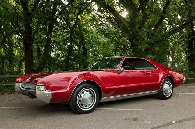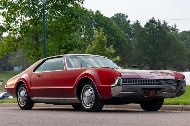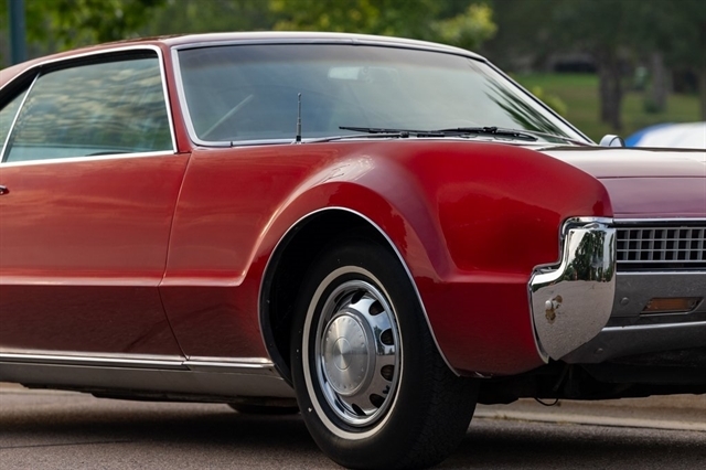 This burgundy beauty features an automatic transmission and was one of the first American cars to offer front-wheel drive, showcasing Oldsmobile`s innovative engineering.
