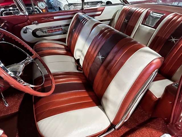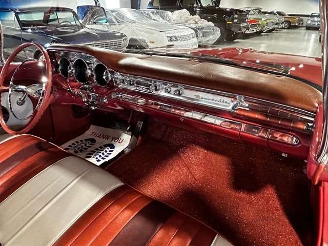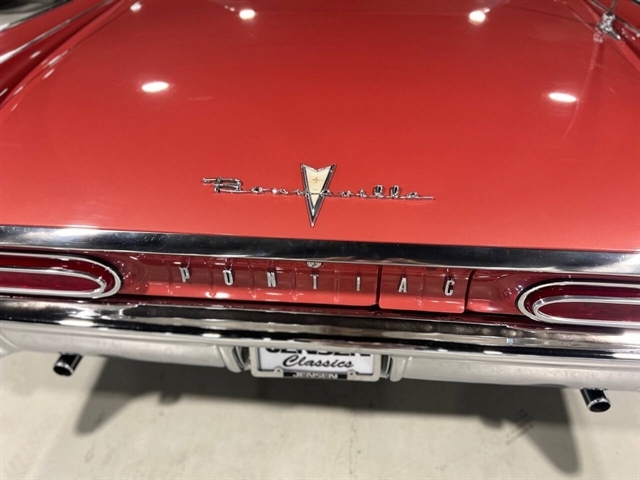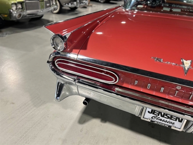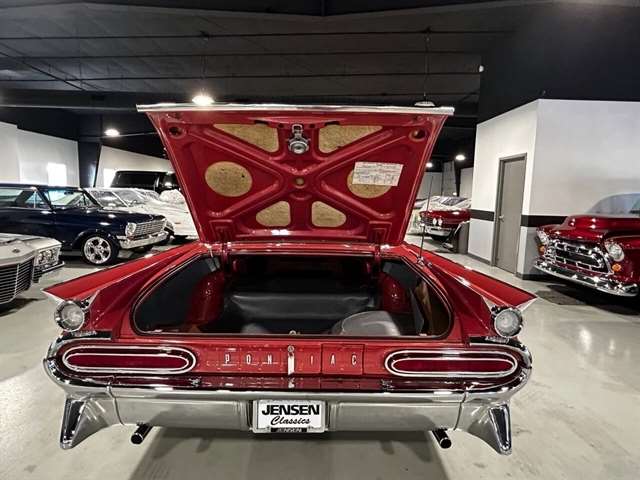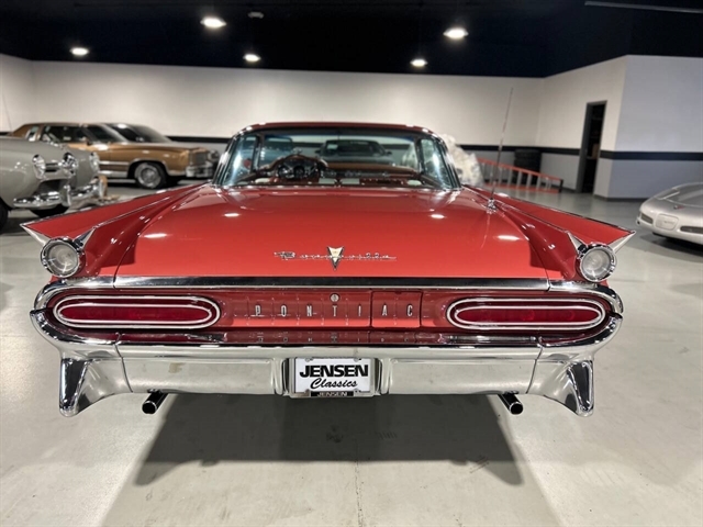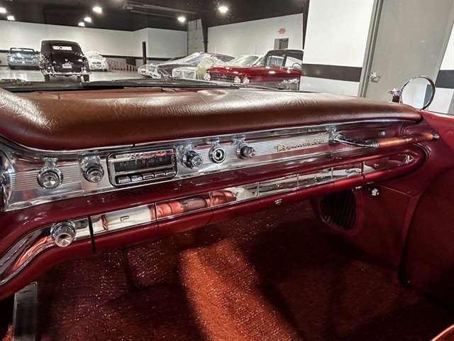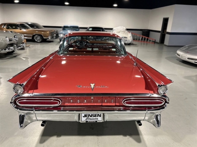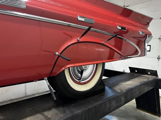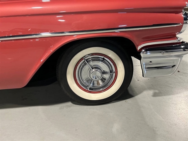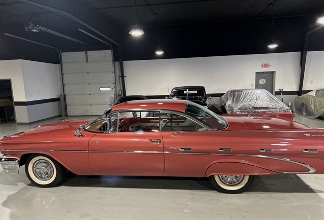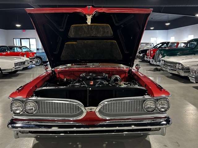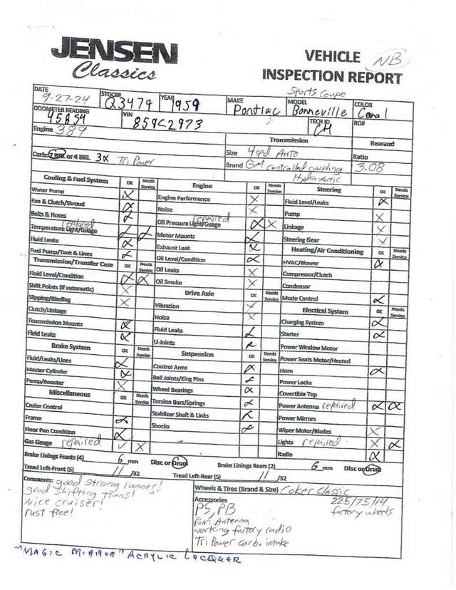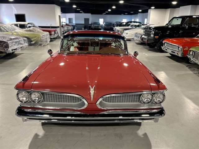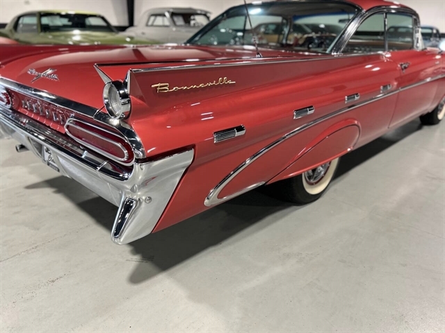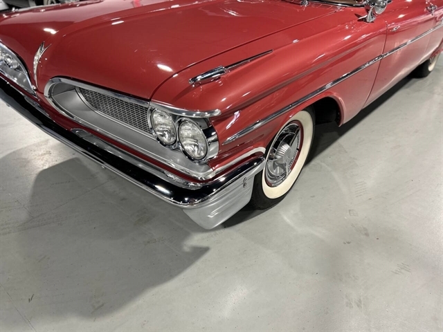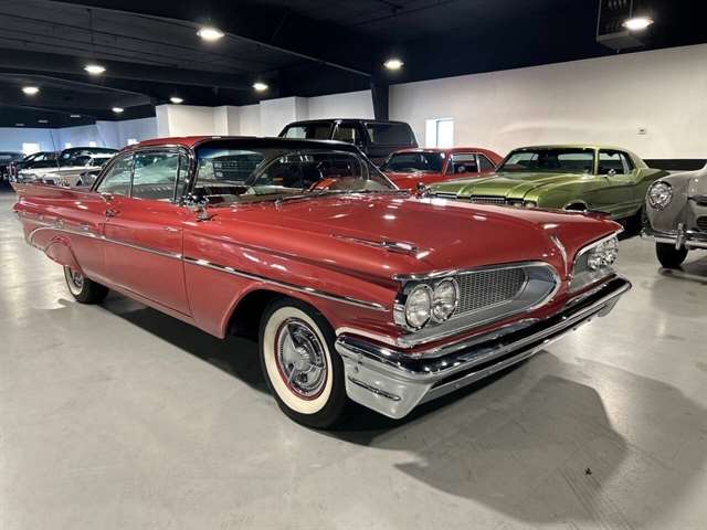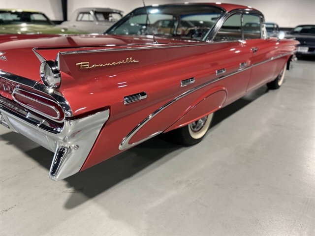1959 Pontiac Bonneville The Bonneville Customer were the prestige offering. They were big, powerful Pontiacs with high level trim and appointments and four-barrel V-8s. Bonnevilles were seat apart by golden scripts on the right-hand grille, rear fins and deck lid four groups of short, horizontal louvers on the projectile-shaped rear fender flares and crest medallions on the deck lid and doors. Regular equipment included all Star Chief features plus padded dashboard, inside door safety reflectors, rear seat foam cushions, dash courtesy lights and padded assist rails for passengers. This 59 Bonneville two-door hard top is stunning. That is certainly not an exaggeration……It’s a descriptive term that comes the closest to describing the overall condition of our Pontiac. The data plate indicates the car was painted in “Magic Mirror“ acrylic lacquer, which appears to be currently the case, and the paint is literally “mirror like”. This was a high dollar restoration of a rust Free 1959 Bonneville with no expense spared, topside, underside, inside, outside, anywhere you look this thing is hard to fault. And awesome power, just an absolute pleasure to drive. 389 with Tri-Power set up, three deuces mated to a GM Hydro Matic transmission, very strong runner. Turnkey condition with all the right equipment being operational, including power steering, power brakes, power antenna, factory radio and more. Riding on a set of Coker classic white wall tires, steel wheels, and correct factory OEM wheel covers.