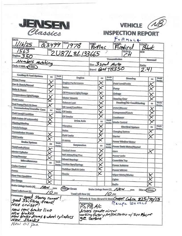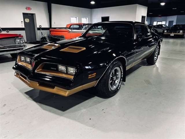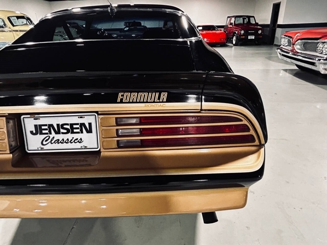 1978 Pontiac Firebird Formula Not sure there’s anything more sinister looking than a double black Firebird Formula especially with the “bandit like” gold accents. This Formula Firebird is exceptional from the paint to the trim to the panel fit to the condition of the interior buckets, carpet, headliner, it’s tough to fault. Numbers matching 350 CI V-8 with a four-barrel mated to a three-speed automatic transmission and it’s got surprising power. Cold factory air conditioning, power steering, power brakes, drivers remote mirror, factory stereo with tape player and riding on a set of Cooper Cobras mounted to set of Pontiac OEM Rally wheels that complement it nicely. All new brakes, front and rear, new shocks plus a recent tune-up. Turnkey condition meaning everything is operating as it should. Owners manual and warranty information pamphlets, maintenance schedule, etc. are all included as well.