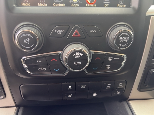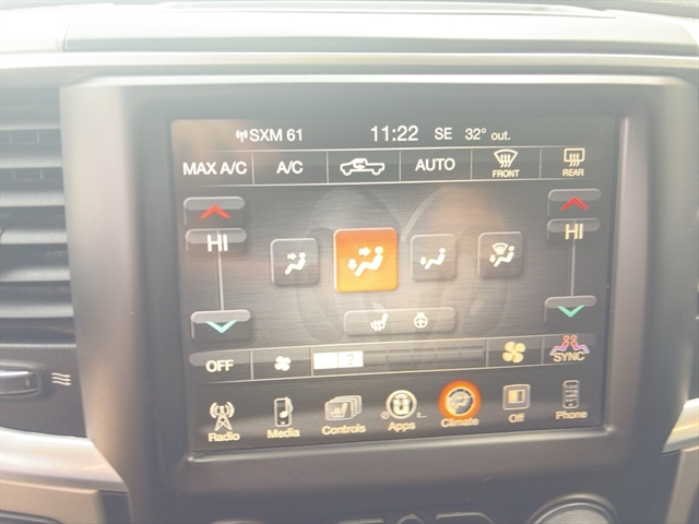 | Heated Seats and Wheel Group: Heated Front Seats; Heated Steering Wheel; Air Conditioning ATC with Dual Zone Control | Quick Order Package 22S Big Horn: Rear View Auto Dim Mirror; Leather Wrapped Steering Wheel; Rear Dome with On/off Switch Lamp; Underhood Lamp; Fog Lamps; LED Bed Lighting; Glove Box Lamp; Bright/bright Billets Grille; P275/60R20 BSW AS Tires; Auto Dim Exterior Mirrors; Big Horn Regional Package; 20" X 8" Aluminum Chrome Clad Wheels; Big Horn Badge; Class IV Receiver Hitch; Security Alarm; Power Heated Fold-Away Mirrors; Electroluminescent Instrument Cluster; Overhead Console with Garage Door Opener; Remote Start System; Full Size Temporary Use Spare Tire; Uconnect 3C Radio with 8.4" Display; Exterior Mirrors with Supplemental Signals; Steering Wheel Mounted Audio Controls; Exterior Mirrors Courtesy Lamps; Air Conditioning ATC with Dual Zone Control; Electric Shift on Demand Transfer Case; Power-Folding Mirrors; ParkView Rear Back-Up Camera; Sun Visors with Illuminated Vanity Mirrors; ParkSense Front/rear Park Assist System |