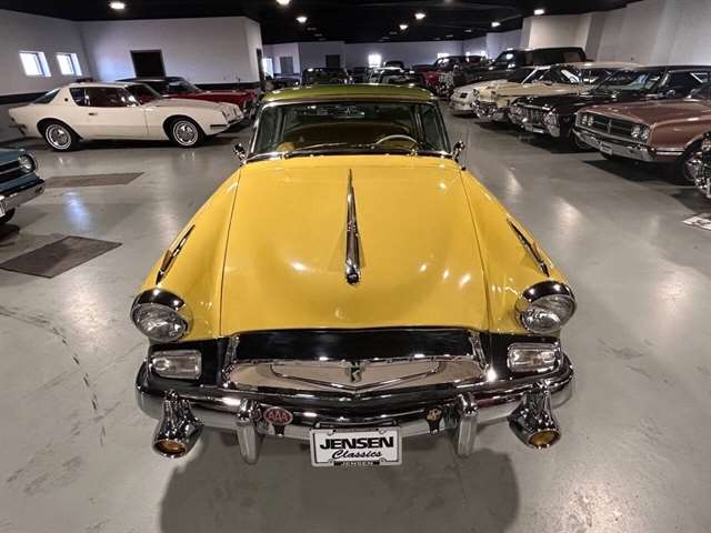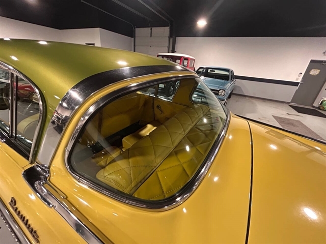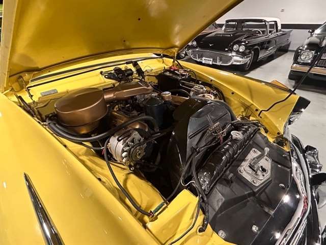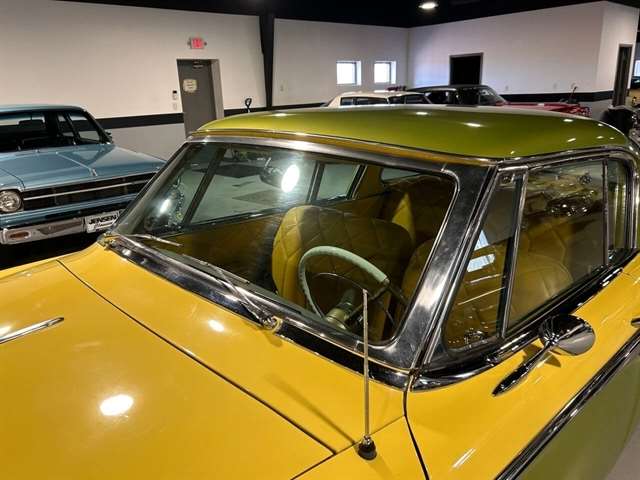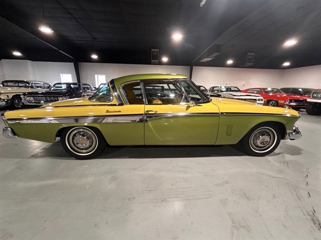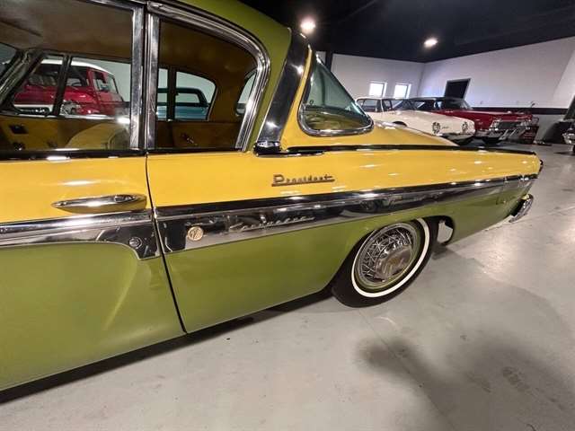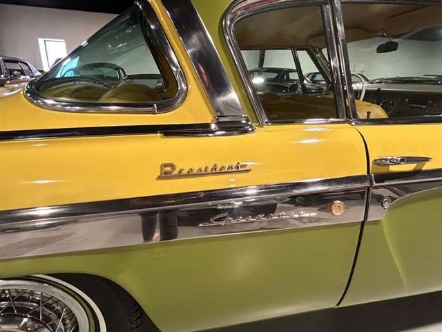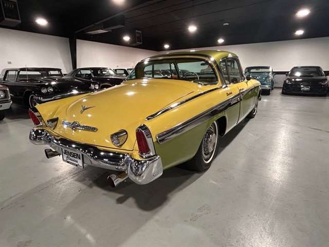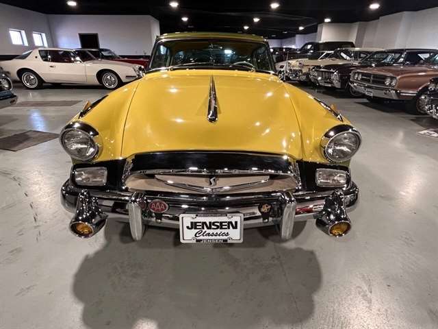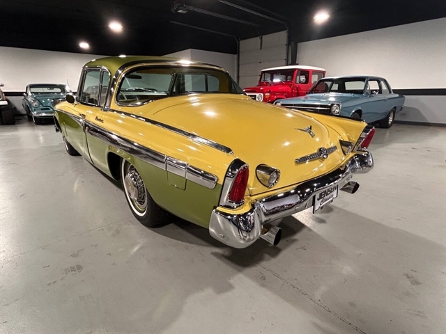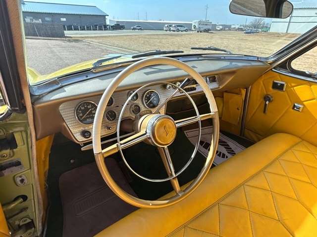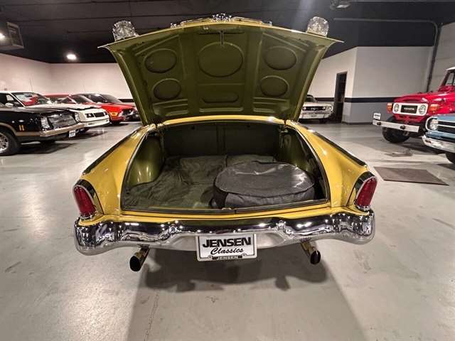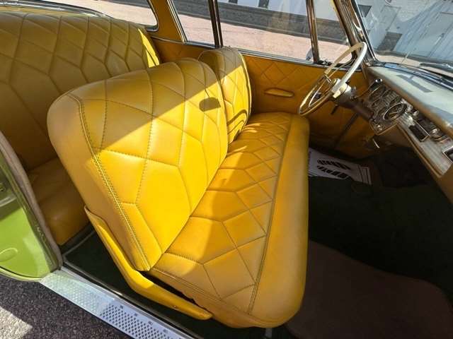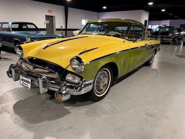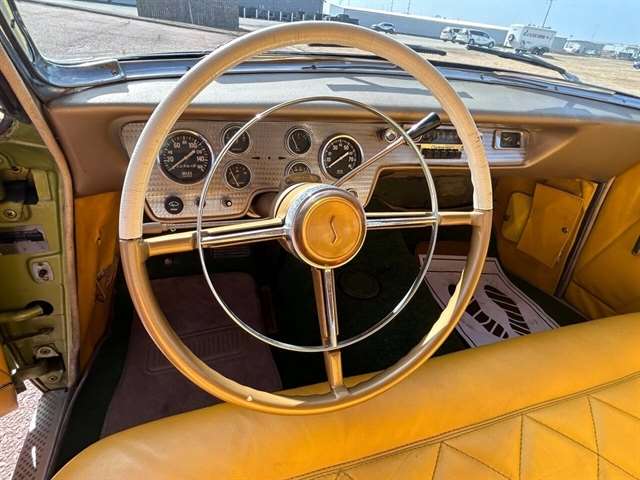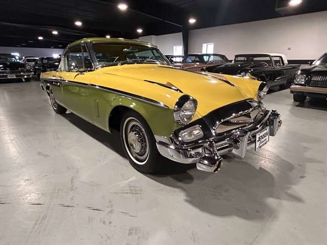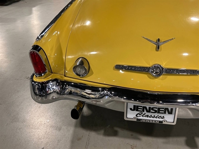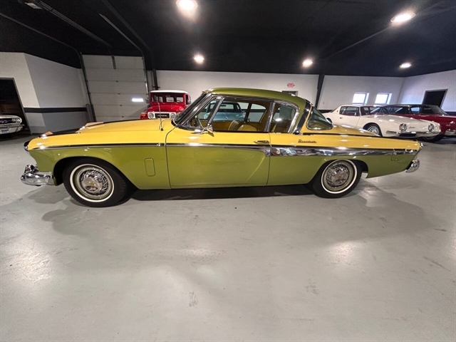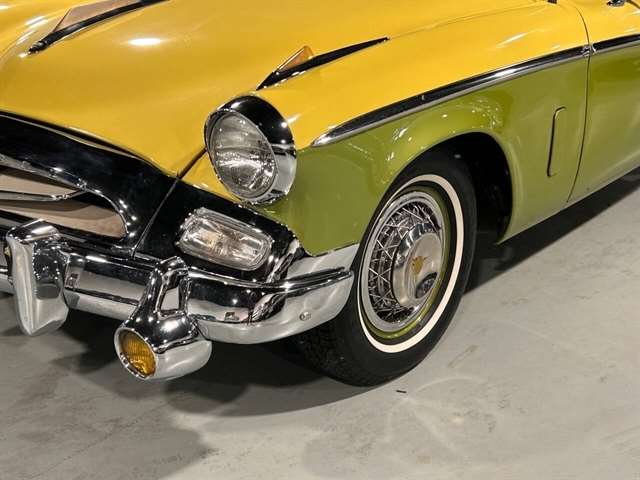 1955 Studebaker President Speedster An initial run of 20 Speedsters was made to be displayed at car shows for the 1955 model year. Reaction to the show cars caused Studebaker’s management to put the car into production mid-year and offer it for the rest of the model year. The Speedsters were loaded with standard equipment, including choice of automatic transmission, or the overdrive transmission, power steering, power brakes, four-barrel carburetor, dual exhaust, “shoemaker-stitched“, quilted genuine top green leather seating, carpeting front and rear, map pocket, push button radio “machine turned “instrument panel with 160 mph speedometer and an 8000 RPM tachometer, turn signals, clock, tinted glass, cigarette lighter, oil filter, dual back up lamps, triple horns, two speed electric wipers, tubeless white wall tires, simulated wire wheel covers and fog light bumperettes. The Speedster presented here is an investment grade collectible, cosmetically and mechanically. It’s hard to find fault with this one-year offering. With the exception of the radio, it’s in turnkey condition. Car is amazing, powered by the venerable 259 V-8 with a four-barrel, automatic transmission, power steering, power brakes, power windows and more. Speedsters in 1955 also came in two and three tone paint jobs, the most famous of which was Hialeah Green and Sun Valley Yellow called lemon lime by the public, which is the example here.