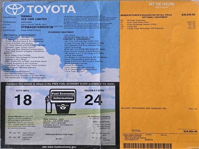 Amazing Find! Like NEW, One-Owner FULLY Loaded XLE Limited AWD!!! This van if fully loaded with Adaptive Cruise, Sunroof, Rear Entertainment DVD, Heated Leather, Park Assist, Brake Assist and so much more!!! Buckle up and get ready to roll in style with this sleek Pearl White 2004 Toyota Sienna! This versatile beauty packs a punch with its powerful 3.3L V6 engine and all-wheel drive capability, perfect for tackling any adventure that comes your way. Glide down the road on 17 aluminum alloy wheels, while the fog lamps light the way ahead. Keep the whole crew comfortable with the tri-zone automatic climate control and entertain them with the rear seat audio system. Need extra storage space? No problem - just fold down the front passenger seat to create more room. With an array of convenient features like the tire pressure warning system and HomeLink universal transceiver, this Sienna is as smart as it is stylish. The spacious interior boasts wood-grain style trim and plenty of storage options, while the dual pwr sliding doors make loading and unloading a breeze. With safety features like front & rear crumple zones and multiple airbags, you can drive with confidence knowing your precious cargo is protected. Don`t miss out on the opportunity to make this well-equipped Toyota Sienna yours today! Visit Rogers Auto Sales Inc. online at www.rogers-autosales.com to see more pictures of this vehicle or call us at 507-442-3111 today to schedule your test drive.