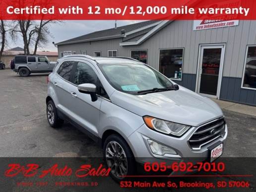 Vehicle Details 2020 Ford EcoSport Titanium — located in Brookings, SD — delivers compact versatility, efficient performance, and upscale features at the best price. Powered by a responsive 3-cylinder 1.0L gasoline engine with front-wheel drive, this Ford EcoSport balances fuel economy with urban agility, making it ideal for daily commuting and weekend escapes. The Titanium trim elevates comfort and convenience with leather seats that provide premium support and easy-care surfaces for busy lifestyles. Tech-forward amenities include Apple CarPlay and hands-free Bluetooth for seamless smartphone integration and safer, distraction-free calling and media control. A heated steering wheel adds warmth and comfort during chilly South Dakota mornings, while rear parking sensors assist with precise maneuvering in tight spaces and crowded lots. Inside, the cabin offers a thoughtful layout with user-friendly controls and ample cargo flexibility for groceries, gear, or luggage. Safety and confidence are enhanced by driver-focused features and a compact footprint that's easy to park and navigate. This Ford EcoSport Titanium presents exceptional value—priced to sell and positioned as the best-priced option in the area. Located in Brookings, SD, this 2020 Ford EcoSport Titanium is ready for a test drive. Contact us to schedule a viewing or for more details about financing and vehicle history. Don't miss this opportunity for a feature-rich compact SUV at the best price.